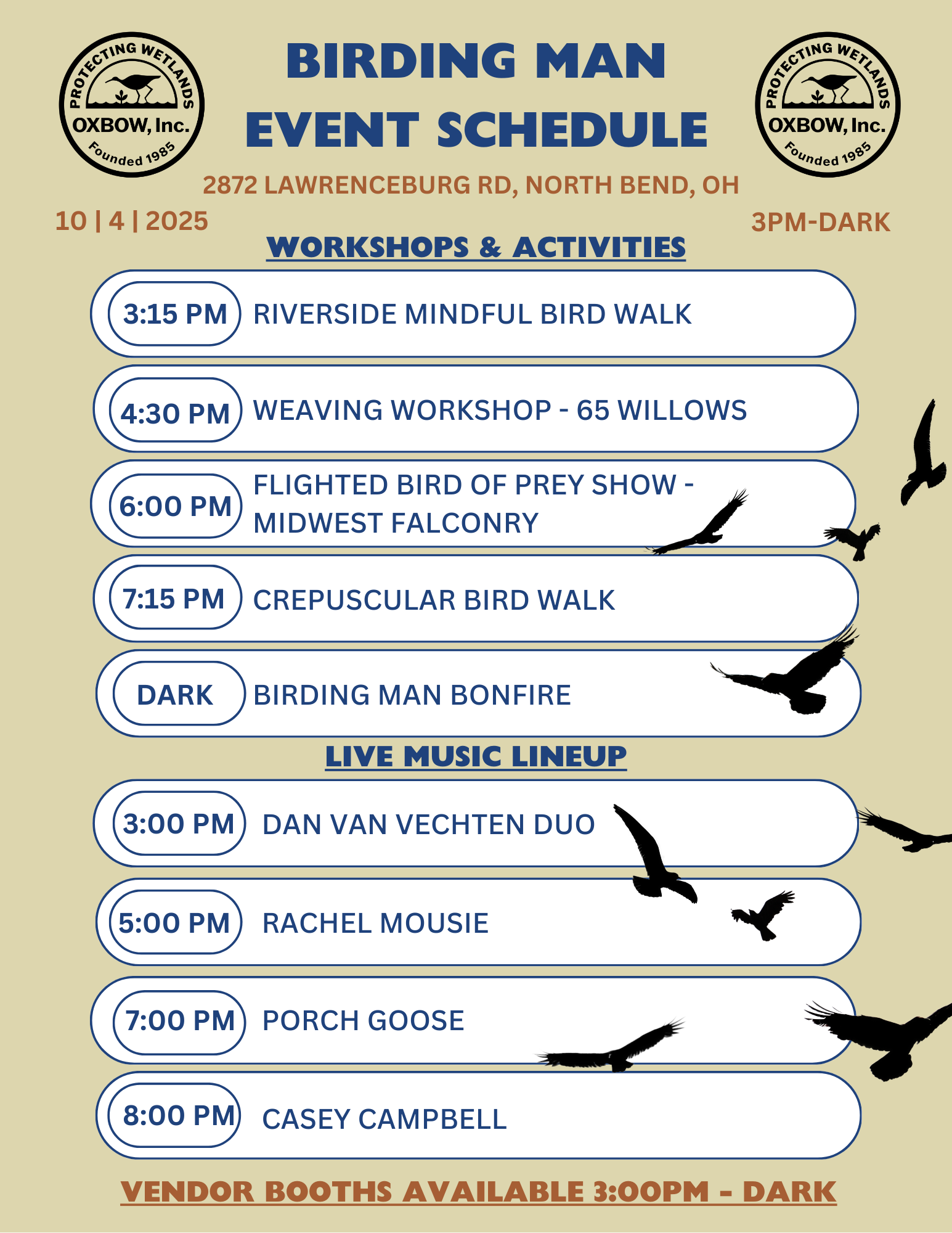 🎶 Live music • 🌿 Workshops • 🦅 Bird of Prey Show • 🚶 Mindfulness & Bird Walks • 🍴 Food + vendors • 🔥 Birding Man bonfire